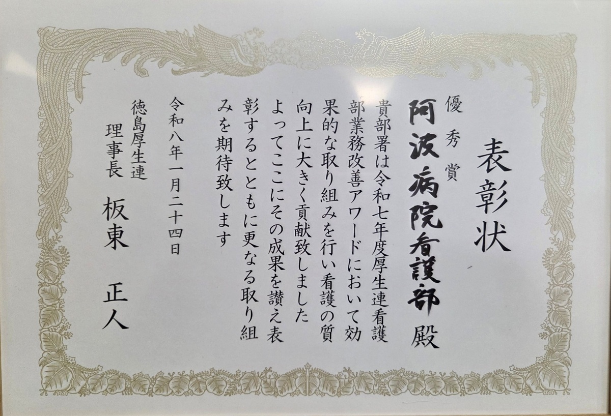 地域包括ケア病棟の佐藤直子師長がプレゼンをし、七題のうちから、阿波病院看護部の取り組みが優秀賞に選ばれました。